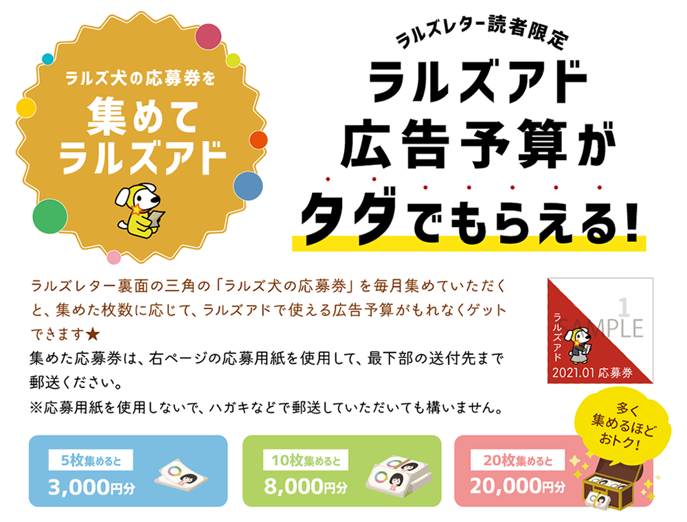 毎月15日前後に届く【紙版】ラルズレターでは、「集めてラルズアド」など、ラルズアドで使える広告予算がタダでもらえるお得なキャンペーンや、スタッフ紹介など、WEB版よりも豊富な情報が掲載されていますので、ぜひ合わせてご覧ください。